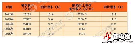 国家统计局公布的最新消费数据显示,2016年全年餐饮收入为35779亿元,同比增长10.8%。其中,2016年1-11月,全国餐饮收入32447亿元,提前一个月超过2015年度全年餐饮收入。