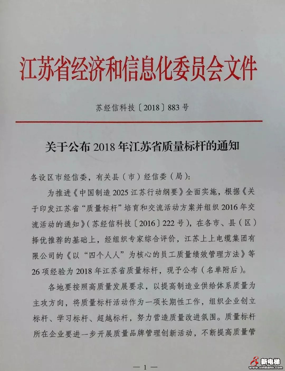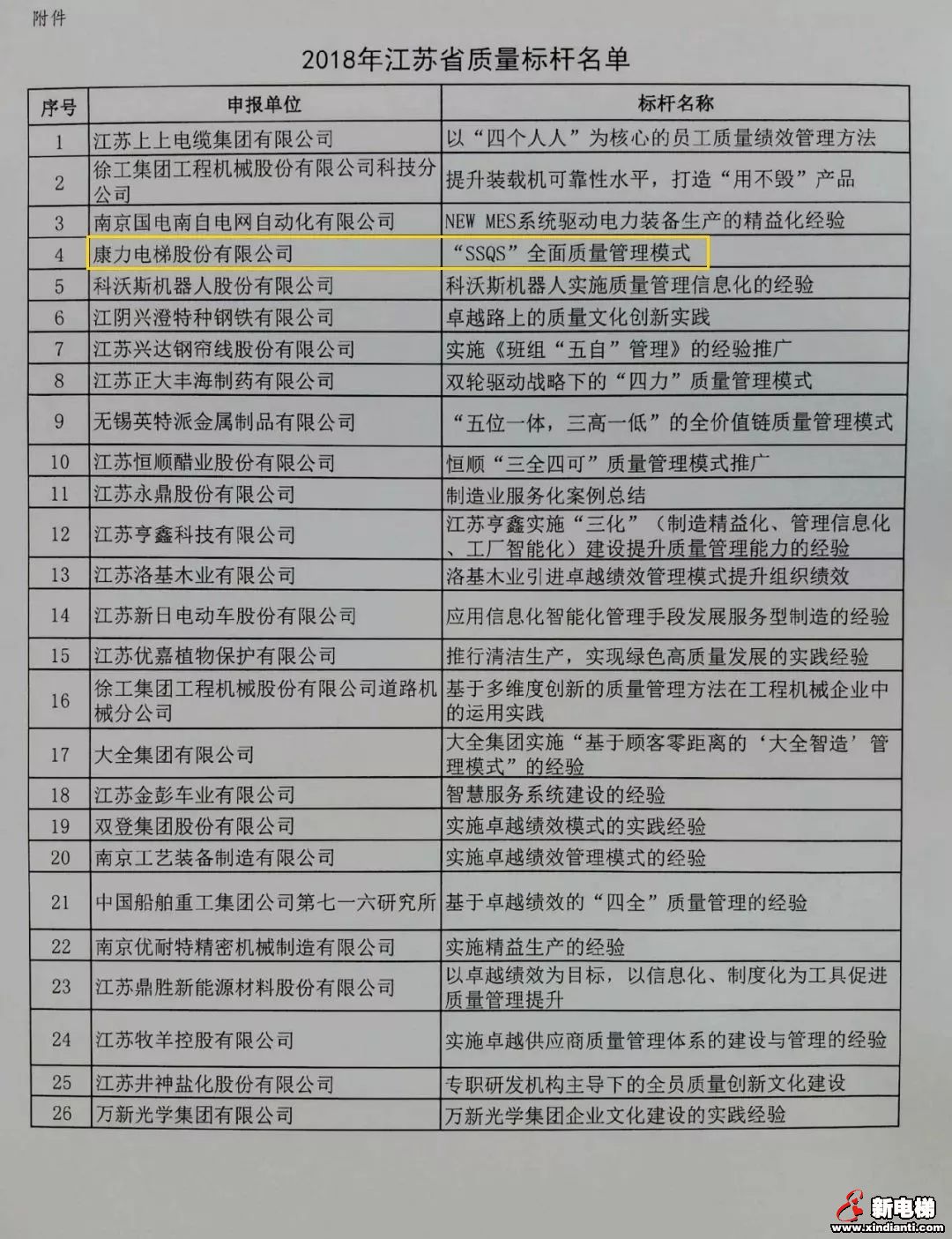 近日,江苏省经信委公布2018年江苏省质量标杆名单,康力电梯申报的《“SSQS”全面质量管理模式》榜上有名,成功荣获这一至高质量荣誉。