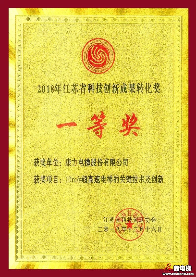 2018年10月8日至11月20日,江苏省科技创新协会举办2018年科技创新奖评奖活动。根据《江苏省科技创新协会科技创新奖励办法》和《江苏省科技创新协会科技创新奖励办法实施细则》的相关规定,经专家组综合评审,康力电梯“10m/s超高速电梯的关键技术及创新”获评2018年江苏省科技创新成果转化奖一等奖。